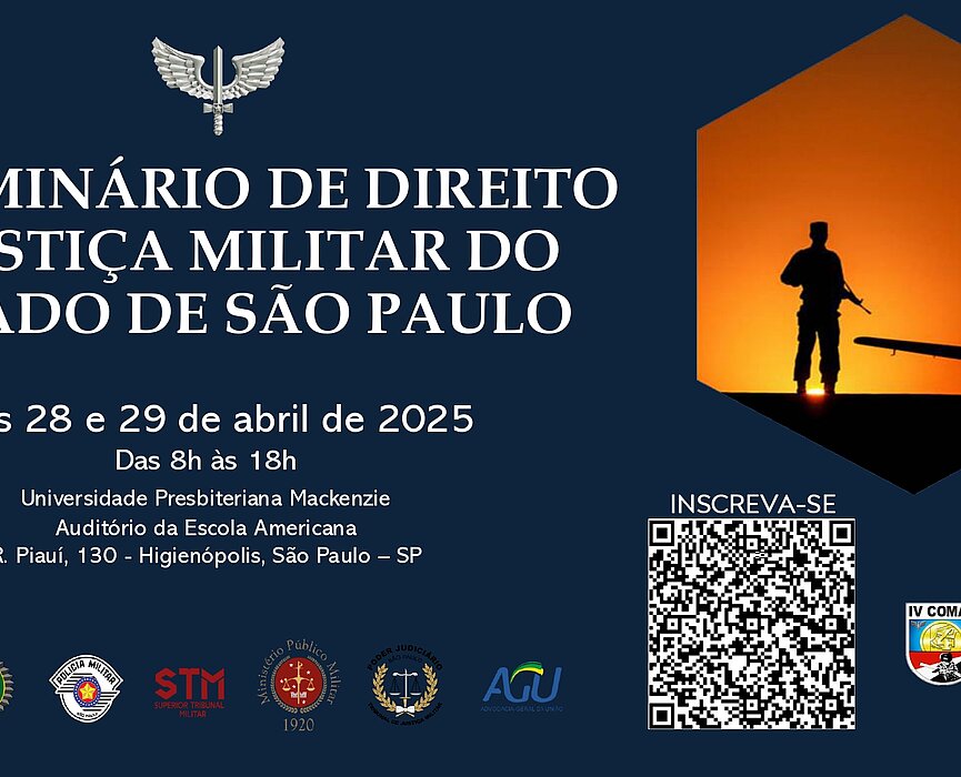 A Faculdade de Direito (FDir) da Universidade Presbiteriana Mackenzie (UPM), em parceria com o Quarto Comando Aéreo Regional (IV COMAR), realizará o IV Seminário de Direito e Justiça Militar do Estado de São Paulo. O evento ocorre nos dias 28 e 29 de abril, no auditório da Escola Americana, campus Higienópolis do Mackenzie. Para participar, se inscreva gratuitamente pelo site.