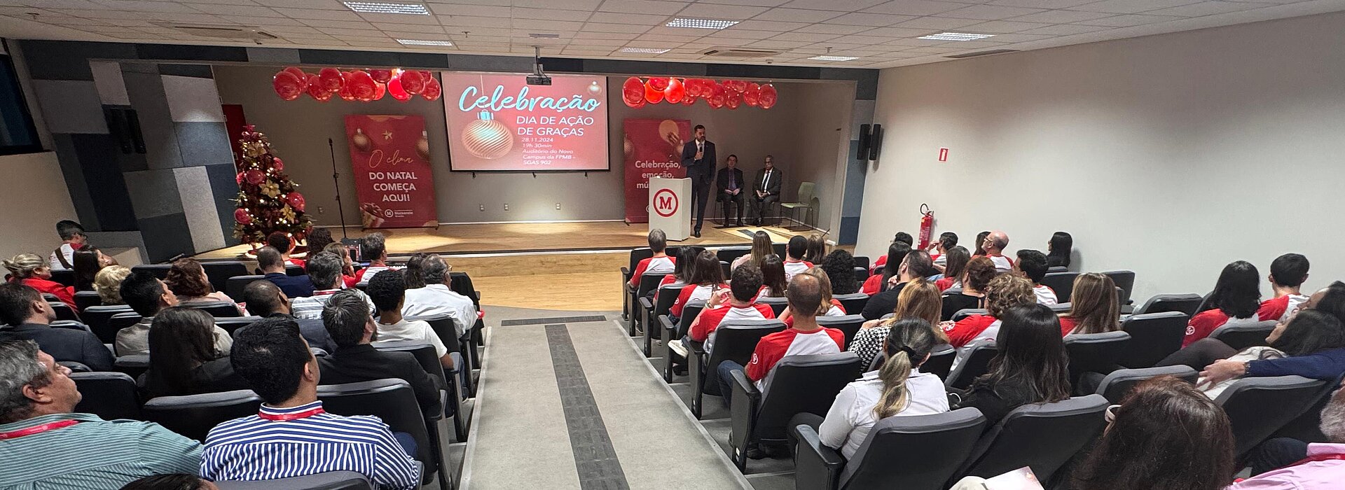 O Dia de Ações de Graças, comemorado na quarta quinta-feira do mês de novembro, é uma data na qual as pessoas expressam gratidão pelas bênçãos do ano. Para celebrar a ocasião, a Faculdade Presbiteriana Mackenzie Brasília (FPMB) realizou, no dia 28 de novembro, o culto de celebração no auditório do novo campus, localizado na 902 sul. A cerimônia reuniu funcionários da instituição e seus familiares em um momento de reflexão pelas bênçãos recebidas durante o ano.