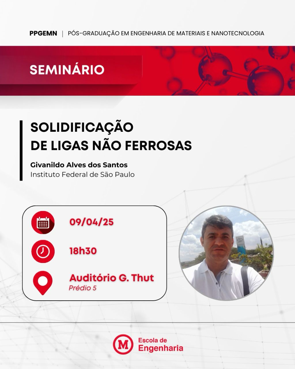 O Programa de Pós-Graduação em Engenharia de Materiais e Nanotecnologia convida a todos para mais uma edição do seu Ciclo de Seminários. Nesta ocasião, contaremos com a presença do Prof. Dr. Ginavildo Alves dos Santos, do Instituto Federal de São Paulo (IFSP), que ministrará uma palestra especialmente voltada à comunidade acadêmica.