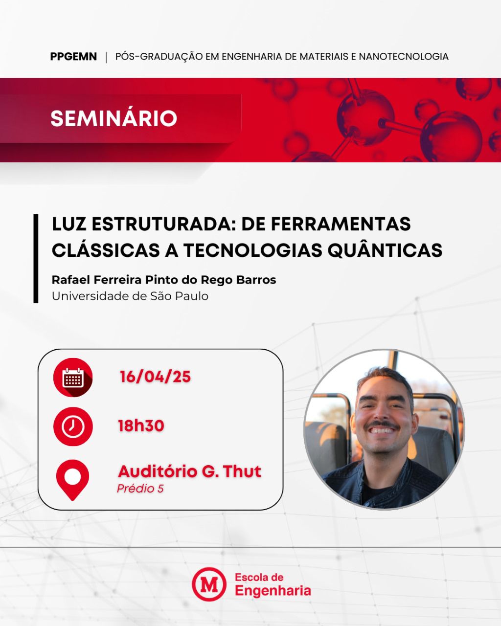 O Programa de Pós-Graduação em Engenharia de Materiais e Nanotecnologia convida a comunidade acadêmica para mais uma edição do seu Ciclo de Seminários. Nesta ocasião, contaremos com a participação de Rafael Ferreira Pinto do Rego Barros, da Universidade de São Paulo (USP), que ministrará a palestra: “Luz estruturada: de ferramentas clássicas a tecnologias quânticas”.