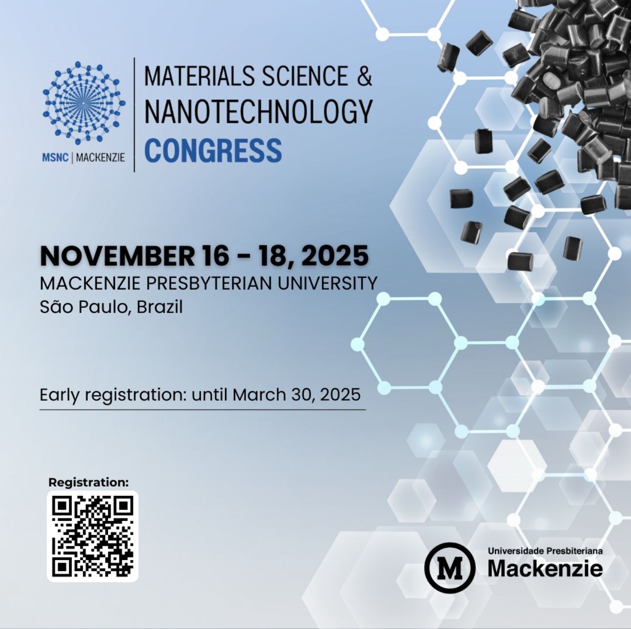 Marque na sua agenda! 📅 O Congresso de Ciência dos Materiais e Nanotecnologia (MSNC) 2025 será realizado na Universidade Presbiteriana Mackenzie, em São Paulo, Brasil, de 16 a 18 de novembro de 2025.