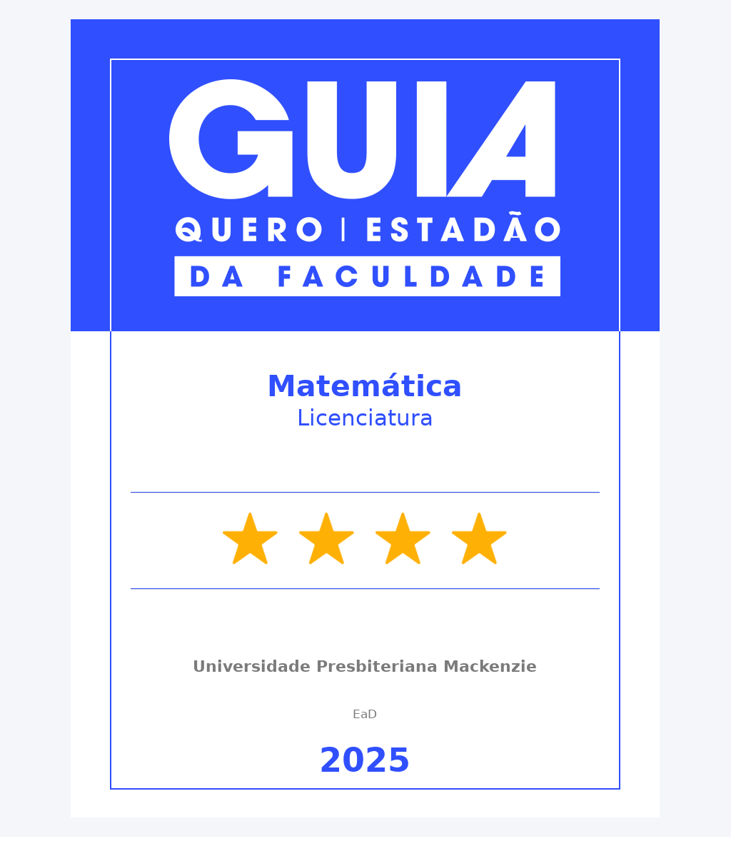Os diferenciais do curso de Licenciatura em Matemática da Universidade Presbiteriana Mackenzie (UPM) são nossa excelente estrutura on-line, nosso acervo bibliográfico de ótima qualidade, uma grade curricular moderna e atualizada e um corpo docente altamente qualificado, além do Laboratório de Matemática (LEM), o qual atende a toda a Instituição (desde o Ensino Fundamental II até a Universidade).