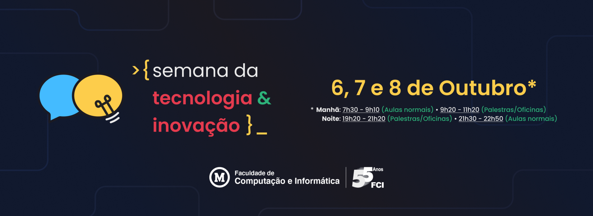 Nos dias 6, 7 e 8 de outubro, a Faculdade de Computação e Informática (FCI) da Universidade Presbiteriana Mackenzie (UPM) promoverá a Semana da Tecnologia e Inovação como parte das comemorações dos 55 anos da FCI.