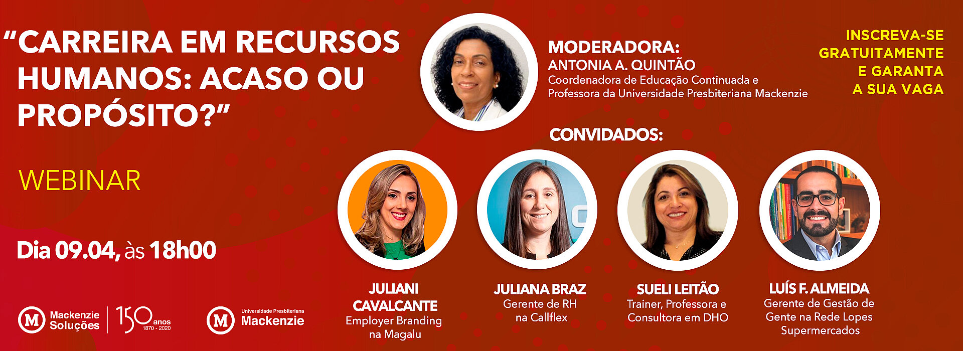 No webinar do dia 09 de abril, estarão presentes no debate a employer branding na Magalu, Juliane Cavalcante; a gerente de RH na Callflex, Juliana Braz; o gerente de Gestão de Gente na Rede Lopes Supermercados, Luís Felipe Almenda; e a trainer, professora e consultora em DHO, Sueli Leitão. A moderação ficará por conta da coordenadora de Educação Continuada da UPM, Antonia Aparecida Quintão.