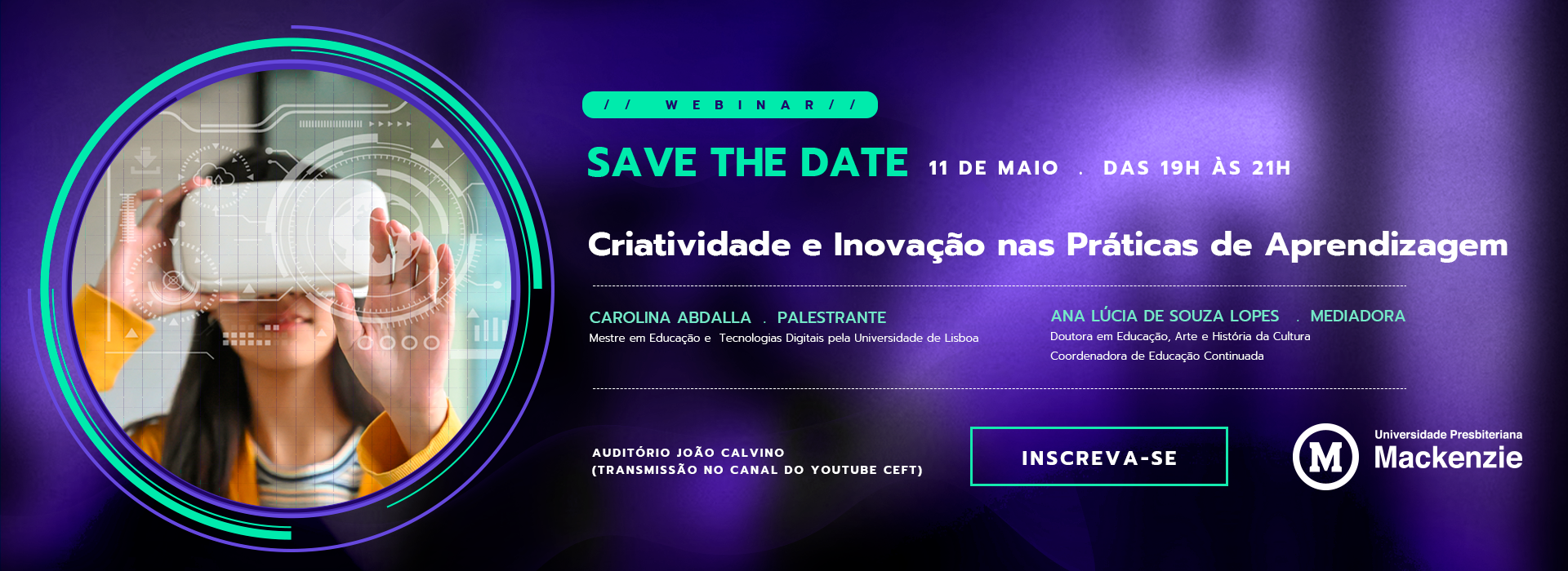 A Universidade Presbiteriana Mackenzie (UPM), por meio do Centro de Educação, Filosofia e Teologia (CEFT), realizará a palestra Criatividade e Inovação nas Práticas de Aprendizagem. O evento ocorre no dia 11 de maio, das 19h às 21h, no auditório João Calvino, campus Higienópolis.