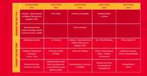 Elétrica sem mistérios, Design Thinking, Empreendedorismo, Desenvolvimento de Softwares, Indústria 4.0, Inclusão, Ética e Marketing Pessoal serão algumas das temáticas abordadas ao longo da semana, não perca!
