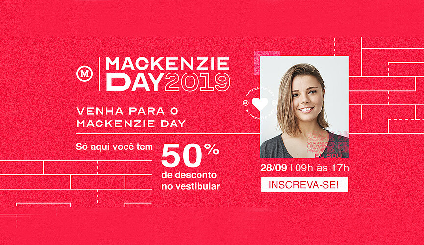 Atenção estudantes do Ensino Médio: o Mackenzie Day 2019 está chegando! No dia 28 de setembro, das 9h às 17h, o Mackenzie, campus Higienópolis, estará de portas abertas para vocês, futuros universitários. Se você tem dúvidas sobre qual carreira seguir, quais são os campos de atuação e sobre como funciona a vida universitária, esse evento foi feito pra você!