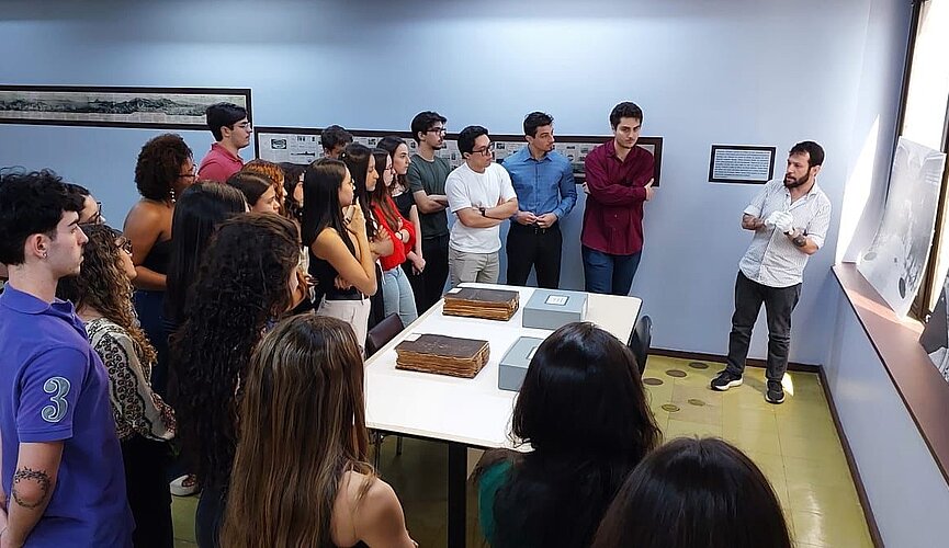 Os alunos do curso de Relações Internacionais da Faculdade Presbiteriana Mackenzie (FPM) Rio visitaram, nesta quinta-feira, 18 de setembro, o Arquivo Geral da Cidade do Rio de Janeiro (AGCRJ), localizado na Cidade Nova, Centro da capital. Ao todo, 20 estudantes, acompanhados pela coordenadora do curso, professora Fernanda Brandão, e pelo professor Leonardo Braga, foram recebidos pelo presidente do Arquivo, professor Elizeu Santiago, e sua equipe.