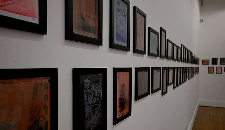 A exposição também materializa as reflexões da pesquisa da artista sobre poéticas visuais e deslocamentos. “Busquei conscientemente uma técnica que ao mesmo tempo fosse fotográfica e retratasse o local, mas que não tivesse a precisão da fotografia. Queria essa coisa meio suja, meio manchada, com pouca nitidez, fui procurando um caminho digital e não gostei do resultado, e aí resolvi tentar a gravura. Foi um caminho de experimentação, de tentativa e erro, até que descobri essa técnica”, detalha Carolina Vigna.