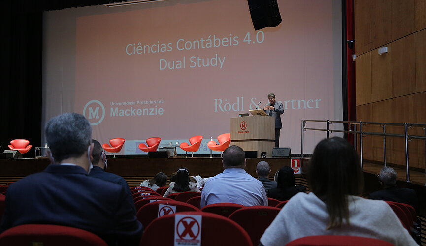No auditório Ruy Barbosa, os representantes das empresas parceiras da formação Dual Study estavam presentes, afinal, o curso foi planejado em parceria com corporações como a Rödl & Partner, Henkel, Bayer, Consulcamp, Ziehl-Abegg e outras.