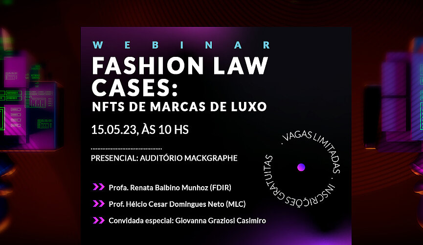 A Faculdade de Direito (FDir) da Universidade Presbiteriana Mackenzie (UPM) realizará o webinar Fashion Law Cases, no dia 15 de maio, às 10h. O evento é parte das comemorações dos 70 anos da FDir, e é organizado pela professora Renata Balbino Munhoz, coordenadora da Pós Digital em Fashion Law, em parceria com o Mackenzie Language Center (MLC). O encontro tem como propósito debater casos paradigmáticos do Direito da Moda, abordando temas como NFTs e Direito de Propriedade Intelectual, com análise de casos como Hermés vs Rothschild e Nike vs Stockx.