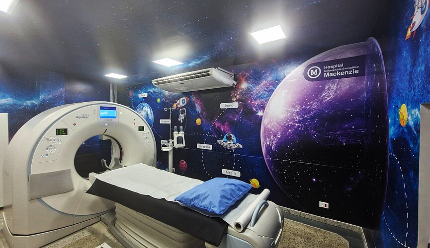 Todas as paredes e o teto da sala destinada ao exame foram plotadas com o tema “Espaço Sideral”. A iniciativa, idealizada pela gerente Maria José Ribas Malheiros, promove uma série de benefícios aos pacientes, impactando no bem-estar emocional e na melhor adesão ao tratamento.