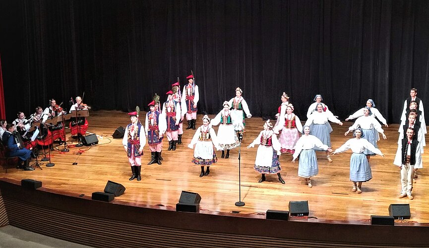 Silêncio no papo para a apresentação do Grupo ZPIT, que chama a atenção com figurinos típicos que mesclam trajes simples e camponeses com os de gala, mostrando que as danças e cantos do espetáculo apresentavam uma sociedade polonesa pré-revolução industrial, além do cotidiano de um povo, desde suas atividades mais simples, tais como a lavagem de roupas e a colheita, até as festas populares e as da alta classe.