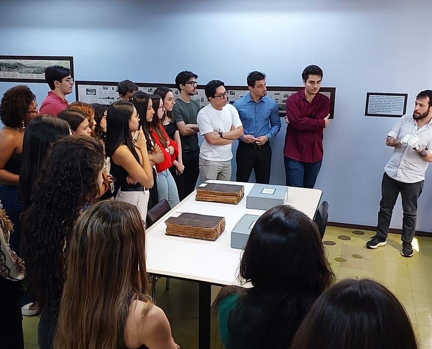 Os alunos do curso de Relações Internacionais da Faculdade Presbiteriana Mackenzie (FPM) Rio visitaram, nesta quinta-feira, 18 de setembro, o Arquivo Geral da Cidade do Rio de Janeiro (AGCRJ), localizado na Cidade Nova, Centro da capital. Ao todo, 20 estudantes, acompanhados pela coordenadora do curso, professora Fernanda Brandão, e pelo professor Leonardo Braga, foram recebidos pelo presidente do Arquivo, professor Elizeu Santiago, e sua equipe.