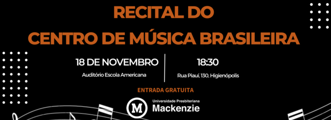 A Coordenadoria de Arte e Cultura (CAC) da Pró-Reitoria de Extensão e Cultura (PREC), da Universidade Presbiteriana Mackenzie (UPM), convida a comunidade para o Recital do Centro de Música Brasileira (CMB), no dia 29 de junho, às 18h, no auditório Escola Americana, campus Higienópolis. A programação, que terá duração de uma hora, apresentará performances de flauta e piano.