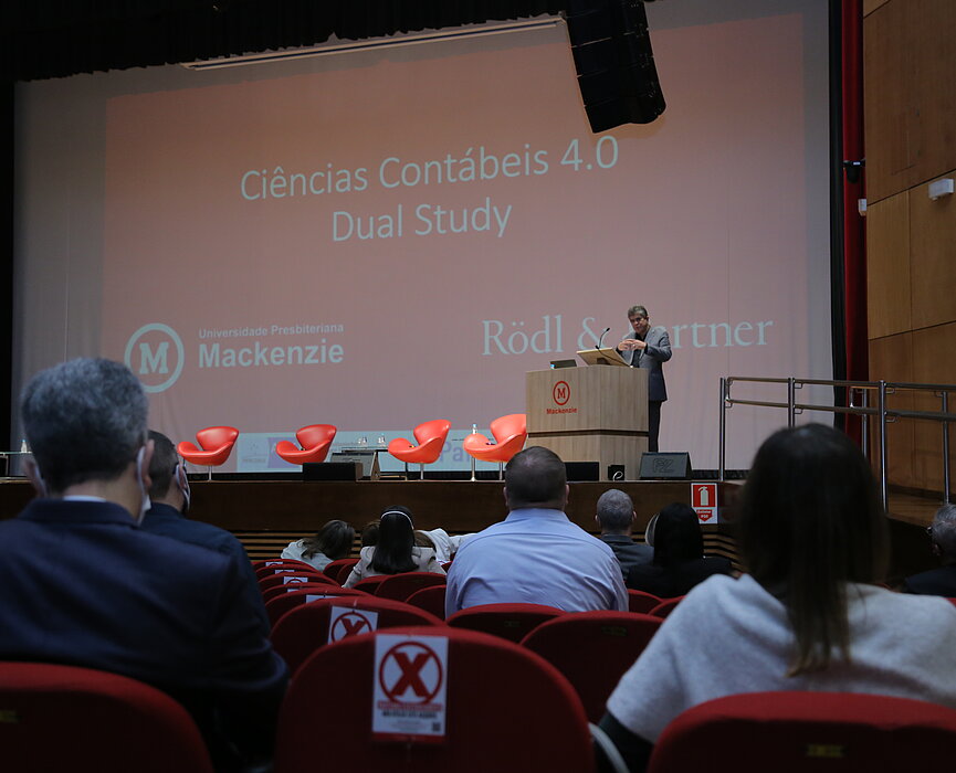 No auditório Ruy Barbosa, os representantes das empresas parceiras da formação Dual Study estavam presentes, afinal, o curso foi planejado em parceria com corporações como a Rödl & Partner, Henkel, Bayer, Consulcamp, Ziehl-Abegg e outras.