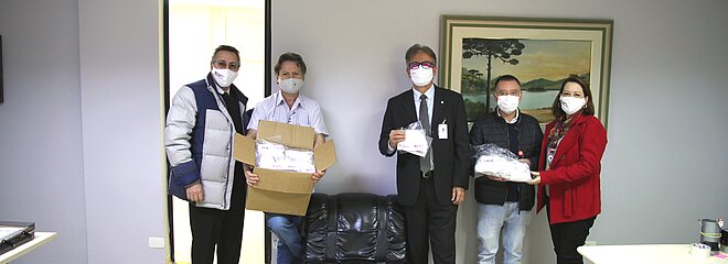 Hospital Universitário Evangélico Mackenzie (HUEM) recebeu a doação de 20 mil máscaras de proteção da Associação Evangelizar É Preciso. O padre Reginaldo Manzotti realizou a entrega da doação para o diretor-geral do hospital, Dr. Rogério Kampa, e para o diretor administrativo, Wilson Costa.