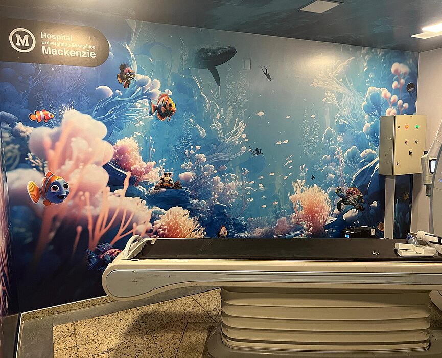 O Hospital Universitário Evangélico Mackenzie (HUEM) inaugurou mais uma sala temática de tomografia computadorizada, desta vez inspirada no fundo do mar. A iniciativa faz parte do trabalho contínuo do Serviço de Apoio Diagnóstico e Terapêutico (SADT) para humanizar o ambiente hospitalar e reduzir o estresse dos pacientes durante os exames.