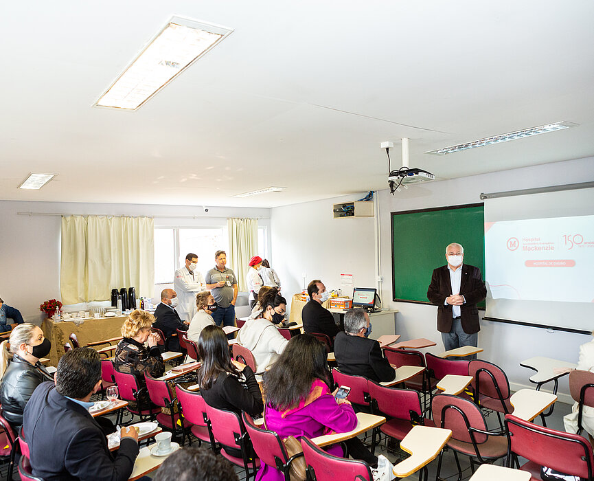 O Hospital Universitário Evangélico Mackenzie (HUEM) recebeu, nesta sexta-feira, 24 de setembro, a visita de 27 dos 38 vereadores da Câmara Municipal de Curitiba (PR). Na ocasião, os parlamentares assistiram a uma apresentação do diretor-geral do HUEM, dr. Rogério Kampa, sobre as atividades desempenhadas pela instituição e os projetos para o futuro.