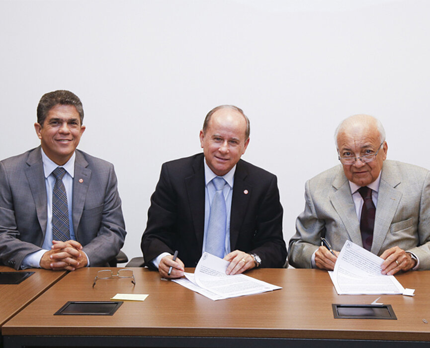 Benedito Guimarães Aguiar Neto – reitor da UPM; Marco Tullio Vasconcelos, vice-reitor da UPM; Josimar Henrique Júnior, diretor-presidente da Hebron; Bruno de Matos Henrique, sócio da Hebron Farmacêutica; Jan Carlo Morais Oliveira e Manoel Salustiano Almeida Saavedra, professores do Centro de Ciências Biológicas e da Saúde (CCBS);, Waldomiro Barbosa, gerente do Mackenzie Soluções; Rinaldo Allara, assessor do Mackenzie Soluções; Samuel Macarenco Beloti, assessor jurídico do Mackenzie.