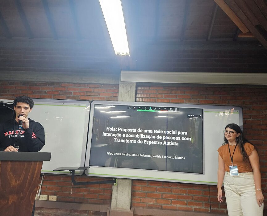 Um dos destaques foi a apresentação dos alunos Filipe Costa e Maisa Folgueral, do curso de Ciência da Computação, sobre o trabalho “Hola: Proposta de uma rede social para interação e sociabilização de pessoas com Transtorno do Espectro Autista”, desenvolvido com a orientação da professora Valéria Farinazzo. O artigo produzido pelos estudantes será publicado como um capítulo do livro Springer Communications in Computer and Information Science.