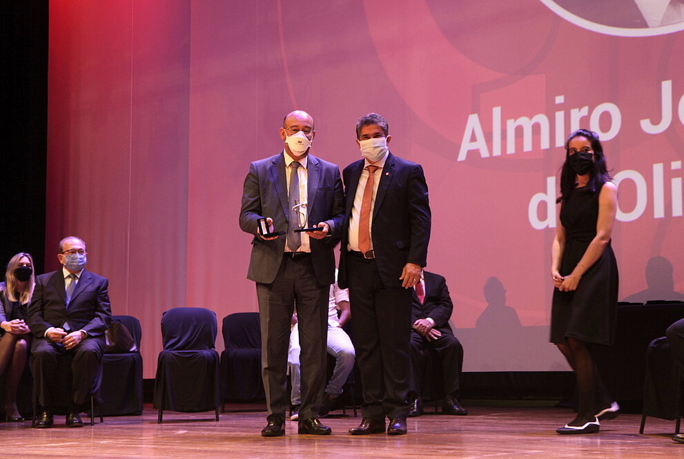 O primeiro homenageado da cerimônia foi Almiro Joaquim de Oliveira, um dos mais antigos funcionários do Mackenzie, com uma carreira de 62 anos de serviços prestados à Instituição, em especial à Faculdade de Direito (FDir) da UPM. A láurea foi recebida pelo diretor da FDir, Gianpaolo Poggio Smanio. “É uma enorme honra receber o troféu em nome do Miro, que tem uma história muito bonita com a Faculdade de Direito, com os nossos alunos e professores. Ele é uma inspiração para todos nós”, declarou.