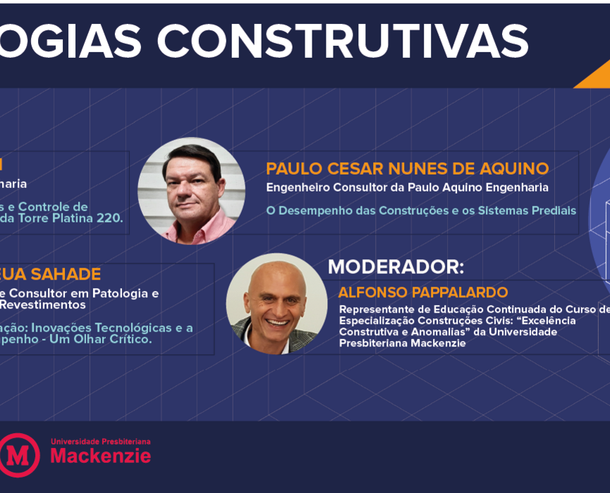 No evento, estarão presentes o consultor em patologia e desempenho de revestimentos, Eng. Renato Freua Sahade; o consultor da Paulo Aquino Engenharia, Eng. Paulo Cesar Nunes de Aquino; e o diretor técnico da Toten Engenharia, Eng. Alexandre Tomazeli. A moderação ficará por conta do representante de Educação Continuada da UPM, Prof. Alfonso Pappalardo.