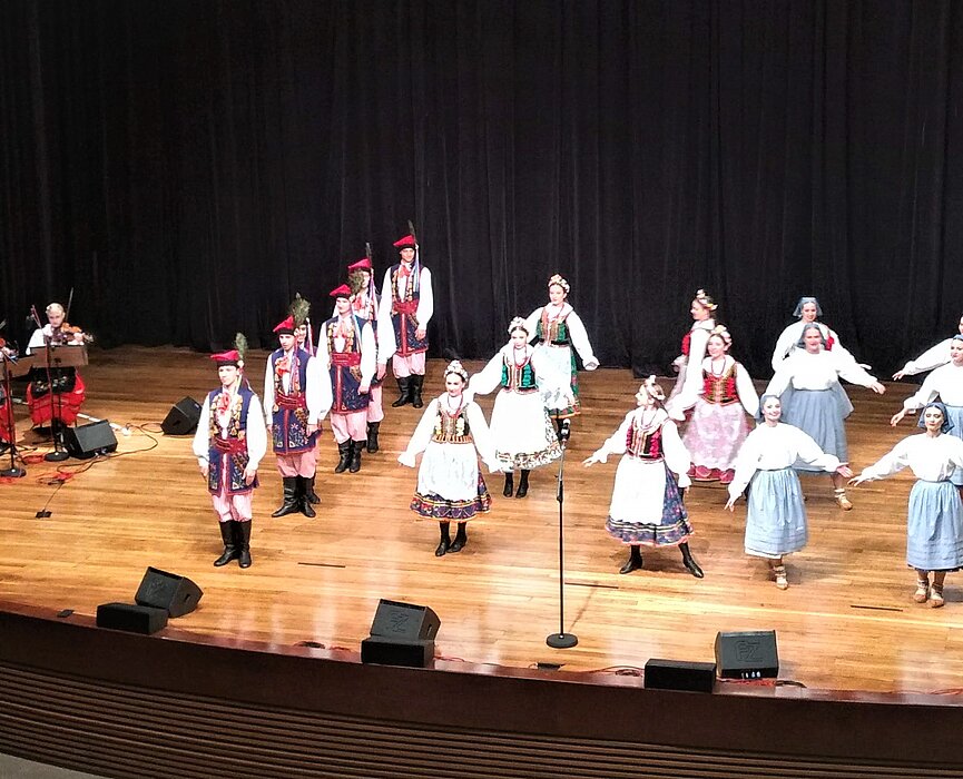 Silêncio no papo para a apresentação do Grupo ZPIT, que chama a atenção com figurinos típicos que mesclam trajes simples e camponeses com os de gala, mostrando que as danças e cantos do espetáculo apresentavam uma sociedade polonesa pré-revolução industrial, além do cotidiano de um povo, desde suas atividades mais simples, tais como a lavagem de roupas e a colheita, até as festas populares e as da alta classe.