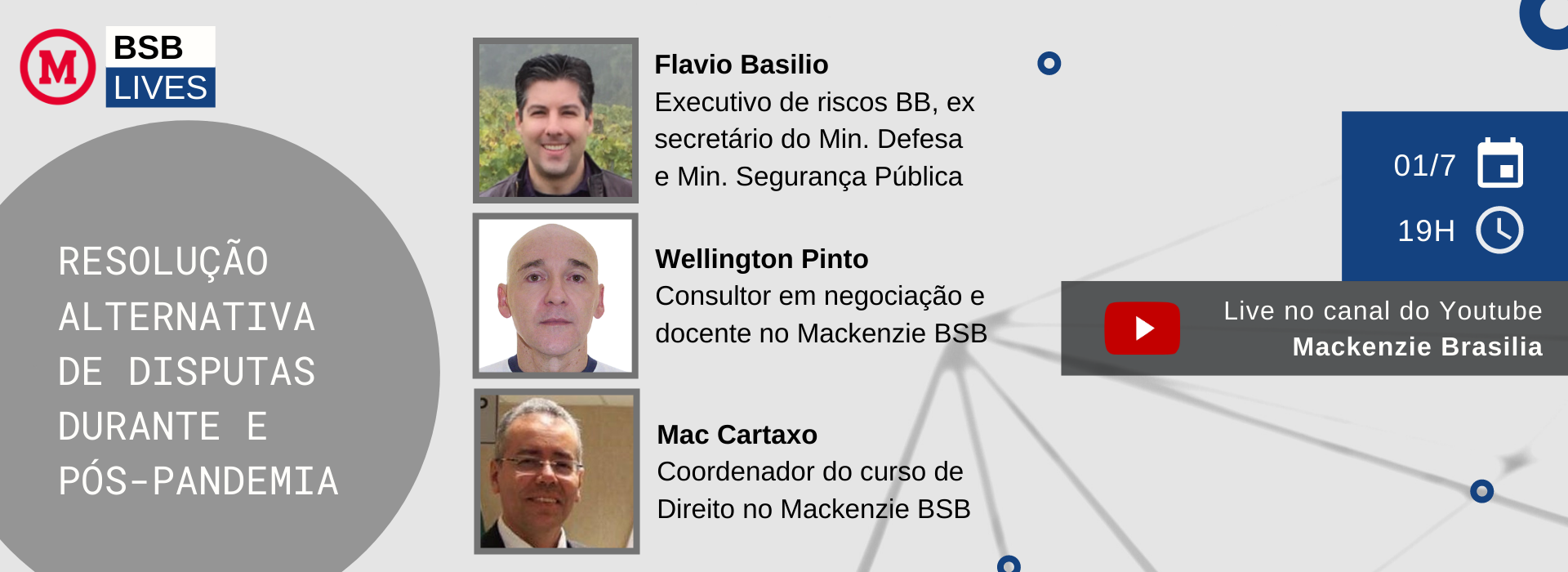 Este será o pano de fundo para a conversa do 8º Mack BSB Lives, marcado para a próxima quarta-feira, dia 8 de julho, às 19 horas, no canal oficial da Faculdade Presbiteriana Mackenzie Brasília no Youtube (clique aqui para acessar). Participarão, ao vivo, do programa três docentes do curso de Direito da Instituição. O Executivo de Gestão de Riscos do Banco do Brasil Flavio Basilio, o Consultor em Negociações Wellington Pinto e o Coordenador da Graduação, Mac Cartaxo.