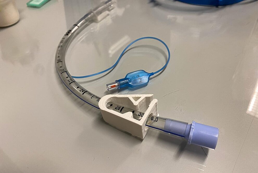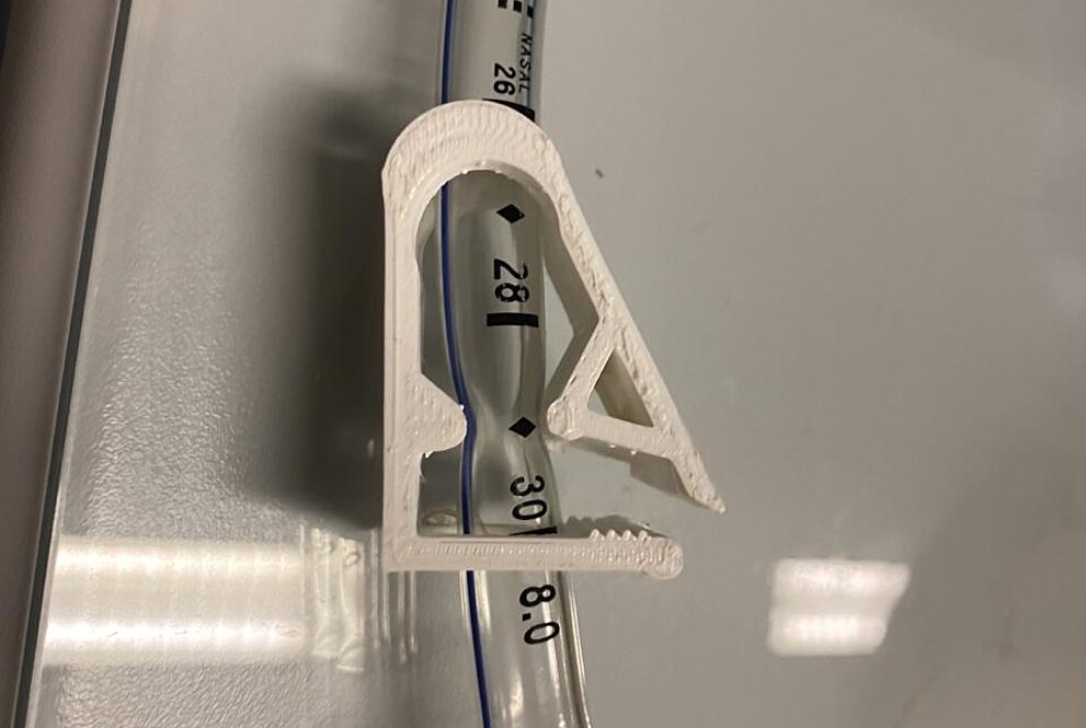 Já o grampo, denominado clamp,braçadeira em inglês, é uma peça com importância mais direta e objetiva em todo o processo. Os pacientes internados com insuficiência respiratória grave recebem um suporte de oxigênio, que é instalado e conectado à sua traqueia por um tubo. Esse instrumento é conduzido até o canal traqueal por meio de um fio guia, posteriormente descartado, abrindo espaço no conduto para a acoplação do suporte.