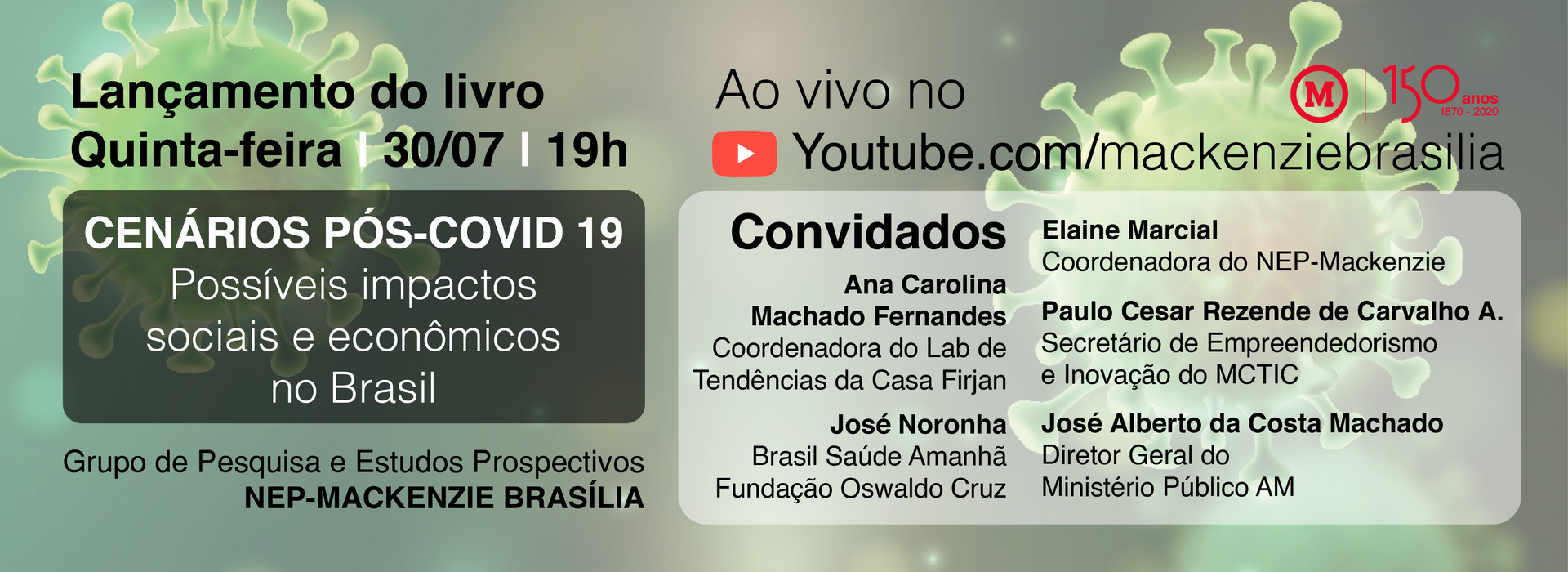 Livro: Cenários Pós-Covid 19: Possíveis impactos sociais e econômicos no Brasil Autor: NEP-Mackenzie Brasília Data: 30 de julho de 2020 - Quinta-feira Hora: 19 horas Local do lançamento:https://www.youtube.com/mackenziebrasilia