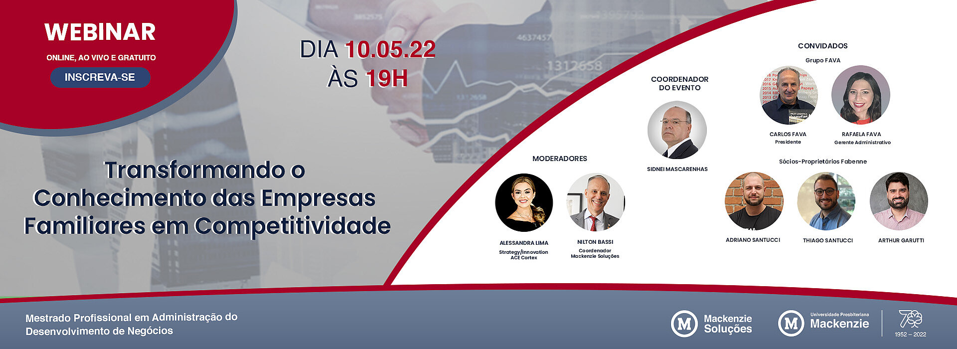A Universidade Presbiteriana Mackenzie (UPM), em parceria com o Mackenzie Soluções, braço de negócios do Instituto Presbiteriano Mackenzie (IPM), realizará o webinar com o tema Transformando o conhecimento das empresas familiares em competitividade, no dia 10 de maio, às 19h. Os interessados devem realizar inscrição neste link. O encontro abordará questões das pequenas e médias empresas que apresentam inseguranças para competir e precisam de um despertar, e também trará dicas e informações relevantes aos que querem iniciar seu negócio, mas estão partindo sem conhecimento específico ou experiência.