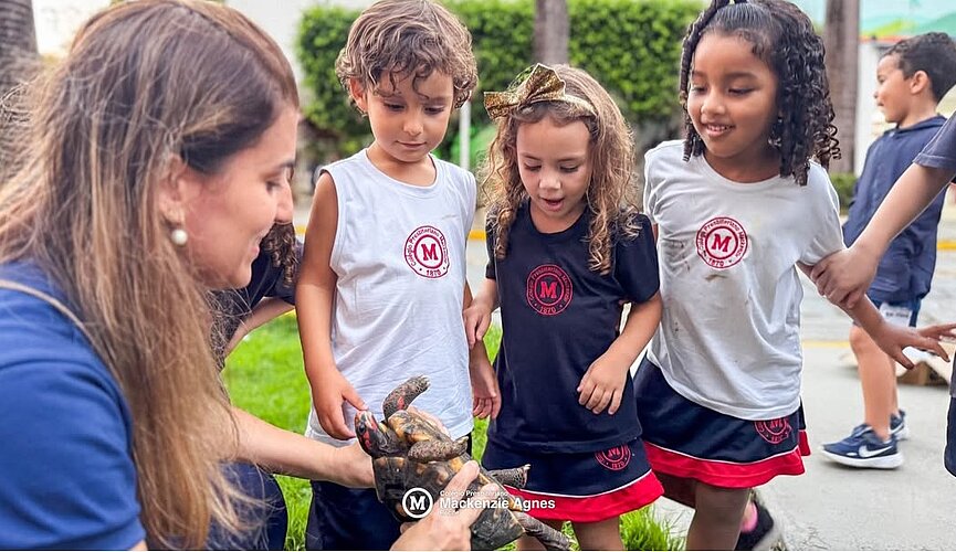 "As crianças ficaram encantadas com a presença do animal. Elas tiveram a oportunidade de observar de pertinho sua casca, as patas, os olhos e observar o jeitinho calmo dela andar. Para muitos, foi a primeira vez que tiveram contato com o animal. Então estimulamos que elas falassem como foi viver esse momento, o que sentiram e o que viram. Em seguida, fizemos juntos uma lista de palavras que também começam com a letra T como: tomate, telefone, tesoura. Foi um momento muito curioso, de muitas perguntas e descobertas. Elas amaram a visita da Tartaruga Lila".