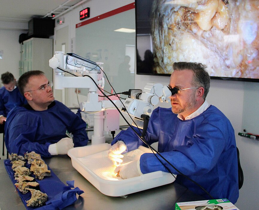 Com 16 vagas disponíveis, o curso abordou atualidades em cirurgia otológica e do osso temporal, incluindo tópicos em tecnologias auditivas e implantes, e também princípios de cirurgia da base lateral do crânio. No primeiro dia aconteceram apresentações teóricas e os dois dias seguintes foram de aulas práticas.