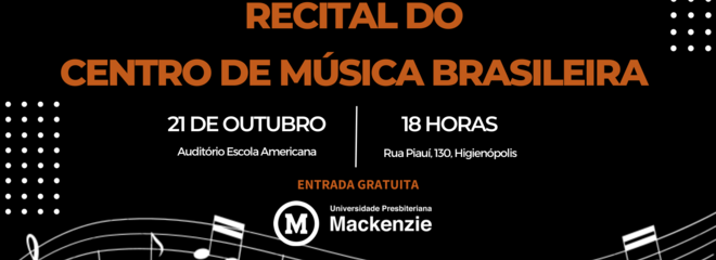 A Coordenadoria de Arte e Cultura (CAC) da Pró-Reitoria de Extensão e Cultura (PREC), da Universidade Presbiteriana Mackenzie (UPM), convida a comunidade para o Recital do Centro de Música Brasileira (CMB), no dia 11 de maio, às 18h, no auditório Escola Americana, campus Higienópolis. A programação apresentará performances de canto e piano.