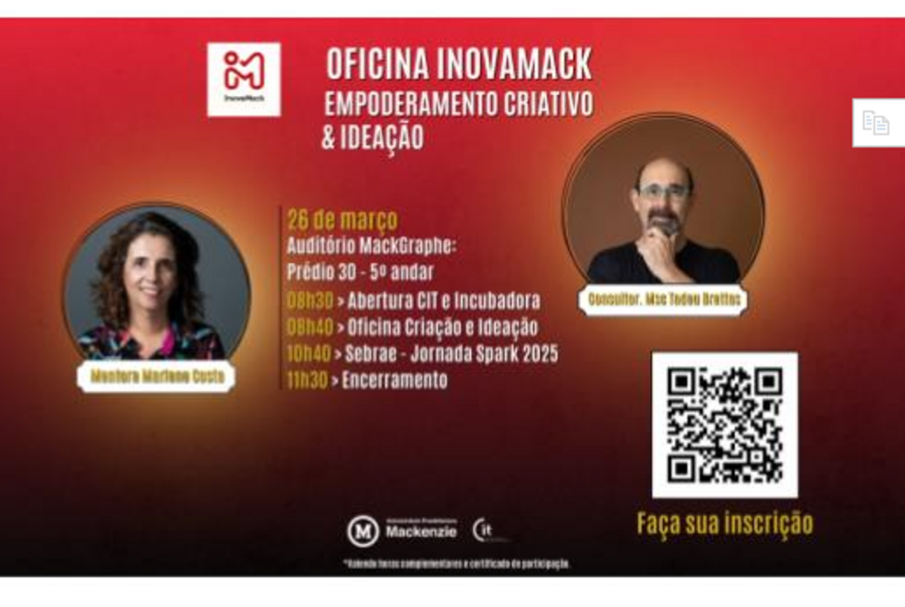 A Inovação e Empreendedorismo da Universidade Presbiteriana Mackenzie (Inovamack) realizará a oficina Inovamack, sobre a construção de um pensamento inovador, na quarta-feira, 26 de março, às 8h30 no Auditório Mackgraphe campus Higienópolis. O evento será gratuito e para participar se inscreva aqui