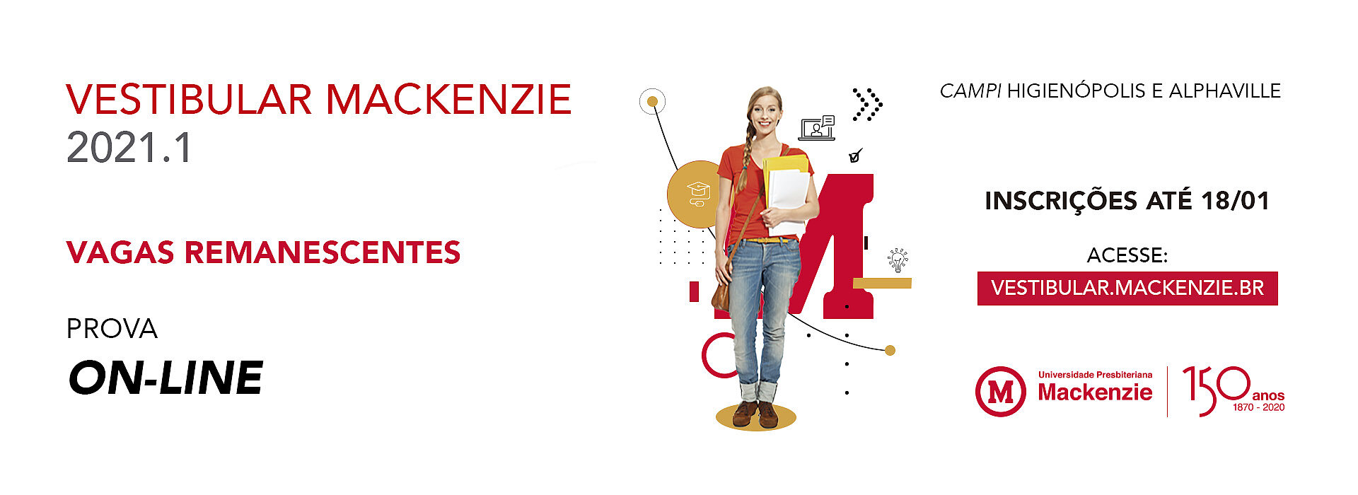 Começam nesta quarta-feira, 13 de janeiro, as inscrições para o vestibular da Universidade Presbiteriana Mackenzie (UPM), voltado para as vagas remanescentes dos cursos de graduação nos campi Higienópolis e Alphaville. O prazo para se inscrever vai até o dia 18 de janeiro.
