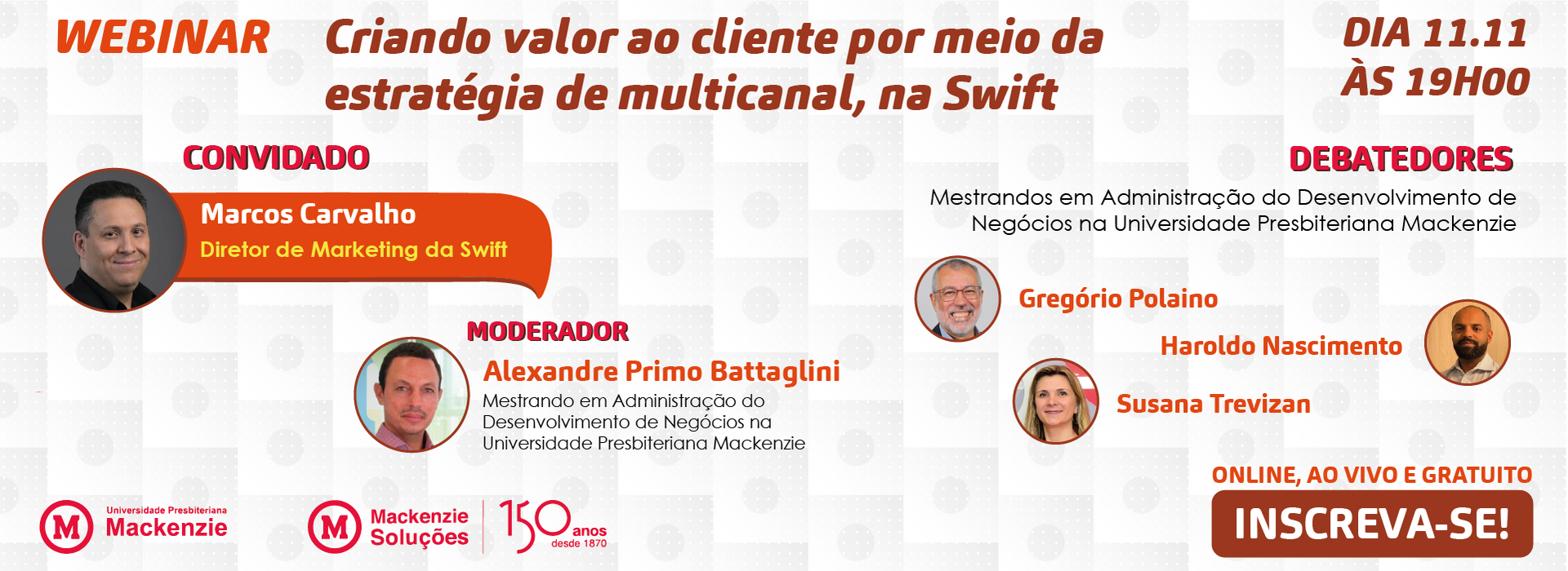 Nesse encontro contaremos com a presença do diretor de Marketing da Swift, Marco Carvalho; na moderação estará Alexandre Primo Battaglini; e para debater Gregório Polaino, Haroldo Nascimento e Susana Trevisan, todos alunos do Mestrado em Administração do Desenvolvimento de Negócios na Universidade Presbiteriana Mackenzie.