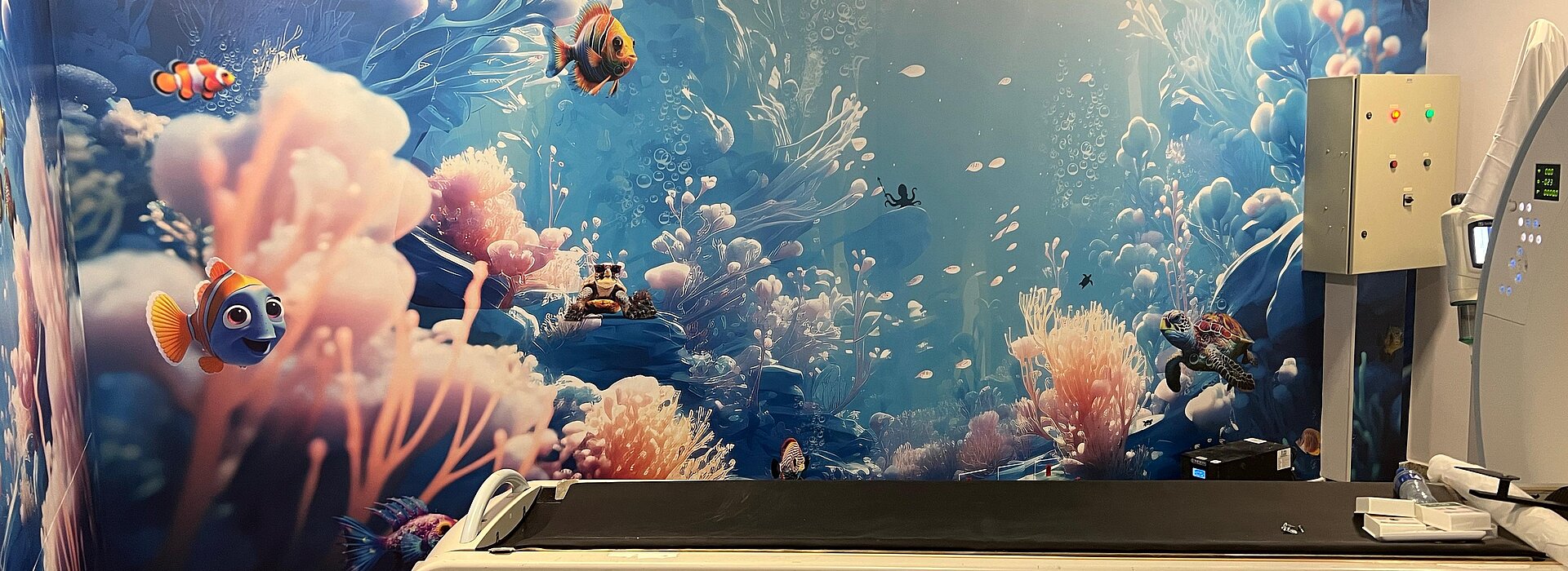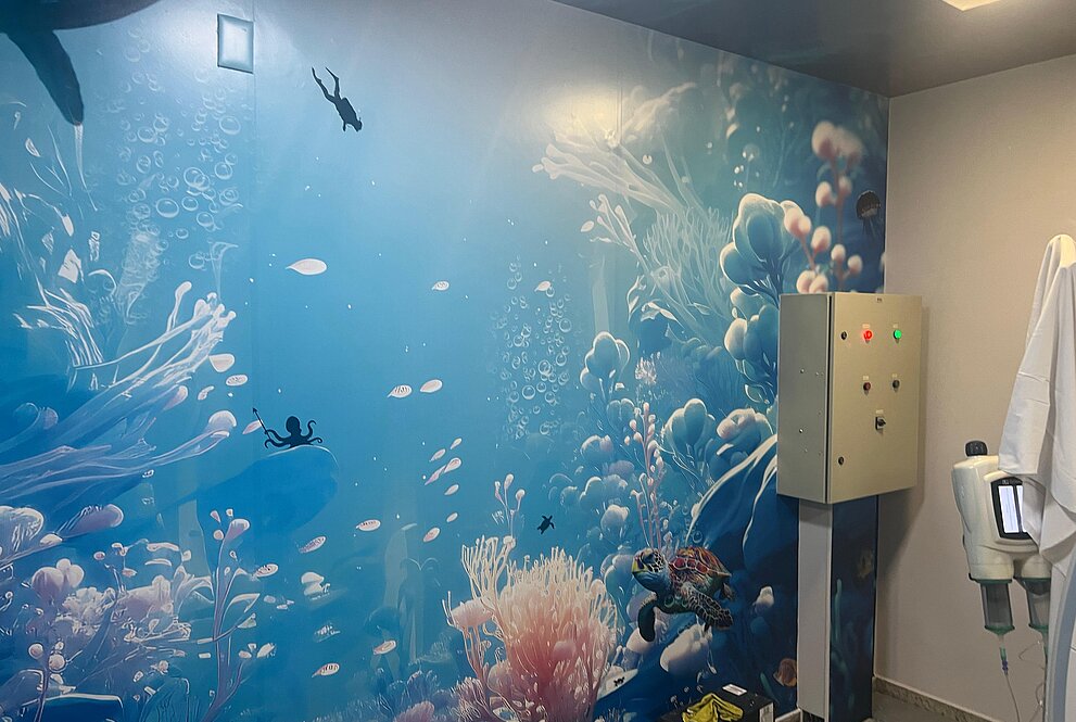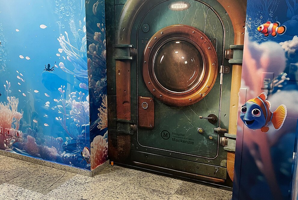 Coloridas ilustrações de peixes, corais, tartarugas e outros elementos marítimos agora preenchem as paredes e o teto da nova sala, criando uma atmosfera lúdica e tranquila. O projeto foi idealizado pela gerente Maria José Ribas Malheiros.