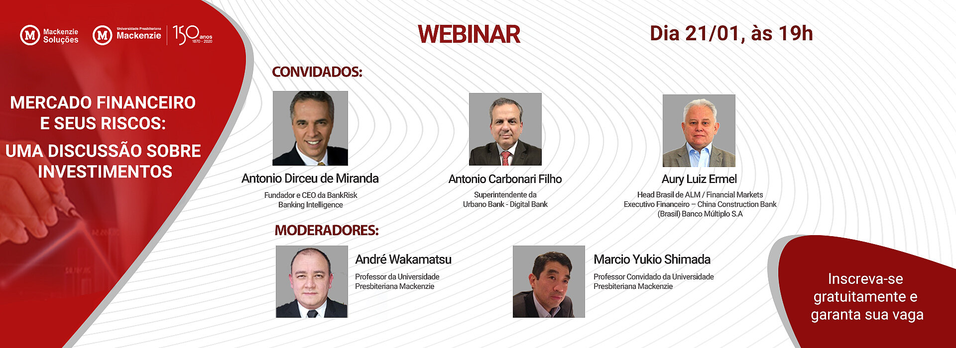 Para o encontro on-line, estarão presentes o superintendente na Urbano Bank - Digital Bank, Antonio Carbonari Filho; o fundador e CEO na BankRisk Banking Intelligence, Antonio Dirceu de Miranda; e o Head Brasil de ALM /Executivo Financeiro na China Construction Bank (Brasil) Banco Múltiplo S.A, Aury Luiz Ermel. A moderação ficará por conta dos docentes da UPM, Marcio Yukio Shimada, professor convidado, e André Wakamatsu .