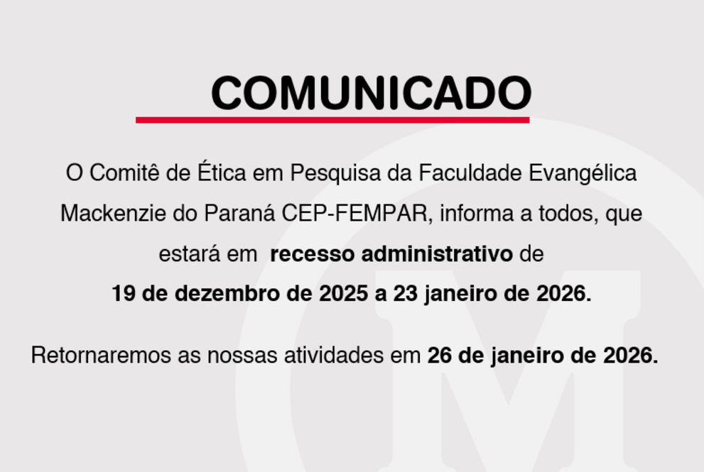 O Comitê de Ética em Pesquisa da Faculdade Evangélica Mackenzie do Paraná CEP-FEMPAR, informa a todos, que estará em recesso administrativo de 19 de dezembro de 2025 a 23 janeiro de 2026.