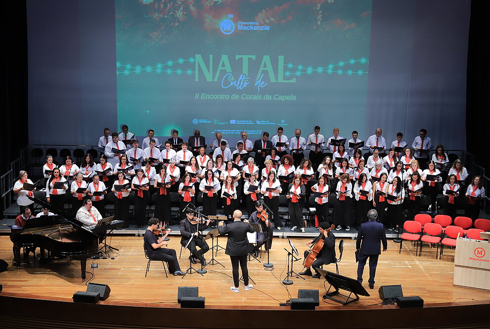 O Mackenzie celebrou, no dia 10 de dezembro, o tradicional Culto de Natal, realizado no Campus Higienópolis, e que neste ano também marcou o segundo encontro dos Coros da Capelania. Conduzida pelo chanceler, Robinson Grangeiro, a cerimônia reuniu autoridades acadêmicas e eclesiásticas, colaboradores, alunos e visitantes em um momento de espiritualidade e reflexão sobre o verdadeiro significado do Natal.