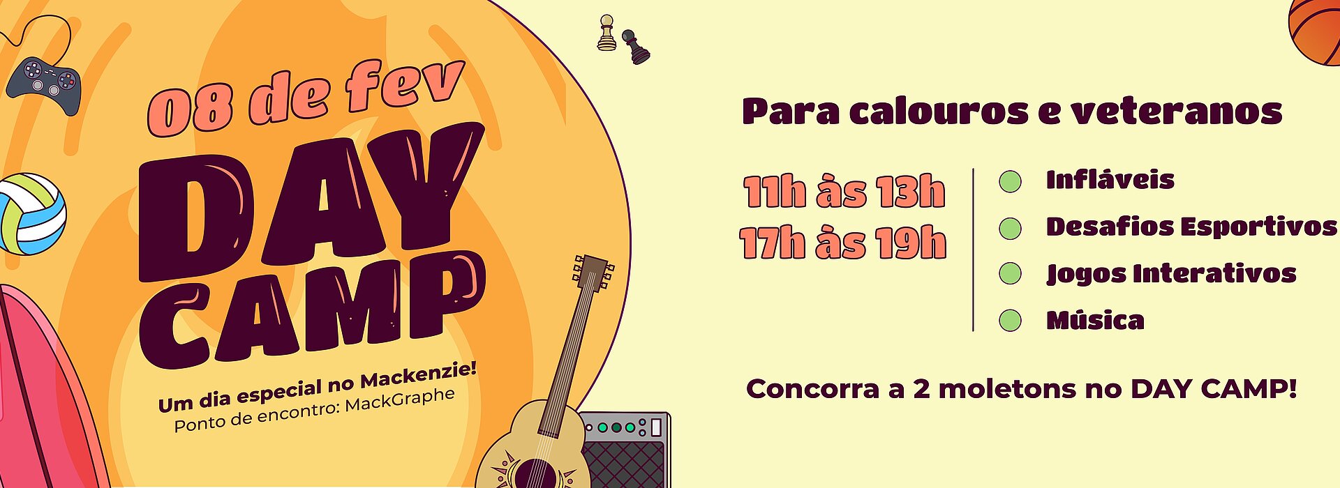 Como parte da programação da Recepção aos Calouros 2024.1, na próxima semana, será realizado, no dia 08 de fevereiro, o Day Camp, organizado pela Chancelaria do Mackenzie com o apoio da Universidade Presbiteriana Mackenzie (UPM), por meio da Coordenadoria de Desenvolvimento Discente e de Carreiras (CDD), da Pró-Reitoria de Graduação (PRGA). Neste dia, calouros e veteranos participarão de atividades esportivas em uma competição entre as unidades acadêmicas. Haverá também brinquedos infláveis, jogos interativos e muita música.