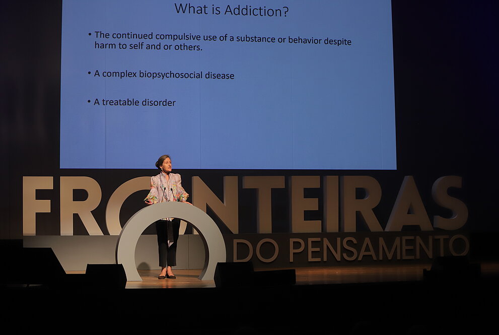Anna Lembke explicou que o vício atua justamente na desregulação desse equilíbrio: ao se consumir uma substância viciante, o pico extremo de dopamina gera um pico tão extremo quanto ou maior de dor e, ao em vez do cérebro alcançar a homeostase, ocorre um déficit, e a pessoa se mantém em um estado de dor. “A pessoa começa a usar a substância para não cair na dor, nem é mais para obter prazer”, apontou.