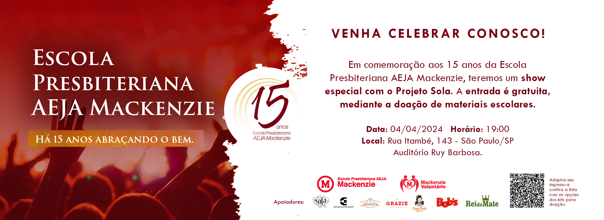 No dia 04 de abril, a Escola Presbiteriana AEJA Mackenzie realizará um evento beneficente em comemoração aos seus 15 anos, completados neste ano de 2024, no auditório Ruy Barbosa, Campus Higienópolis. A celebração contará com o show do Projeto Sola, além da participação do Coral AEJA Mackenzie.