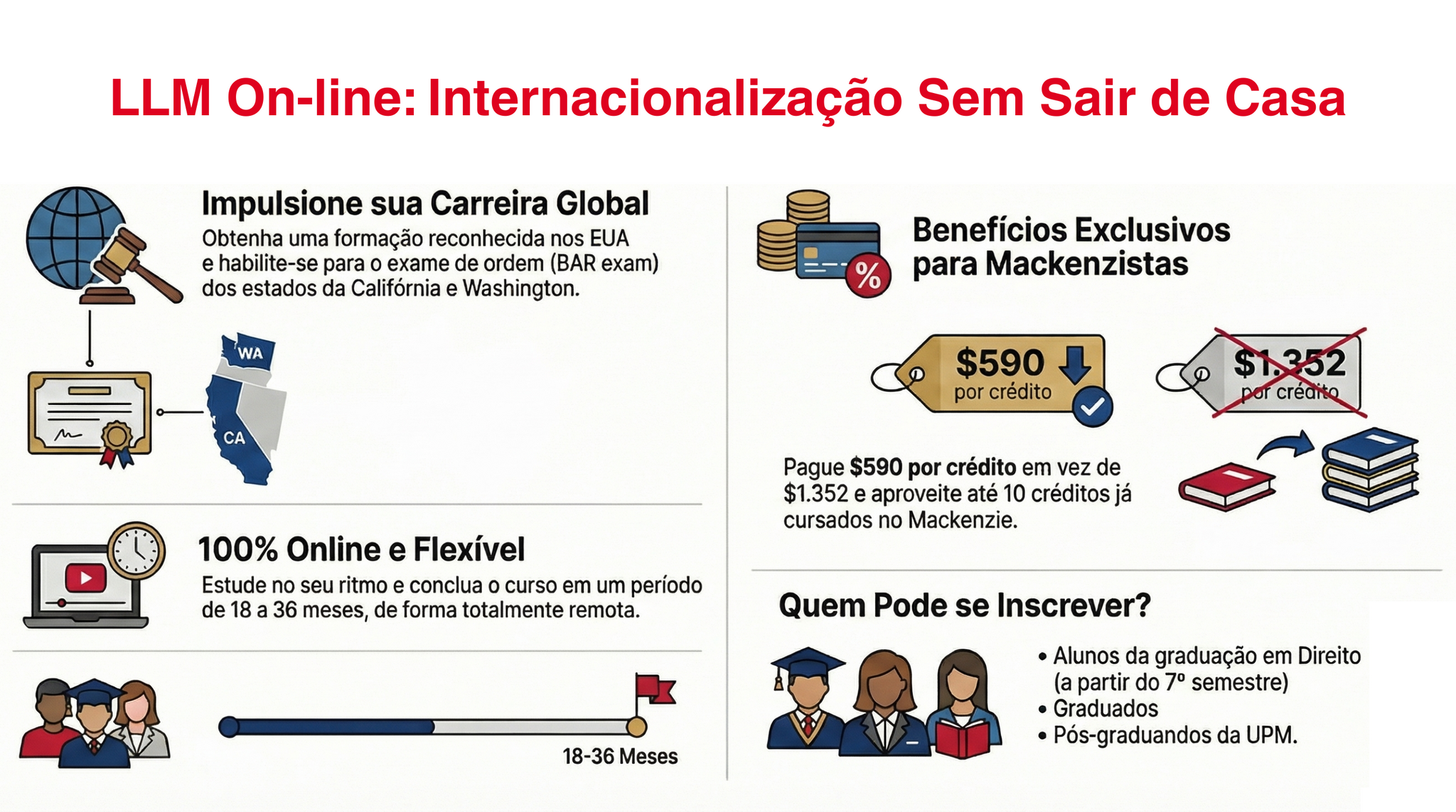 Assim, o estudante pode adaptar a dinâmica de estudo à sua rotina, sem ter que sair do país e incorrer em custos adicionais usualmente exigidos em programas de LLM, como passagem aérea, seguro de viagem, alimentação, hospedagem. Trata-se de programa ofertado em ambiente inovador, flexível e acessível.