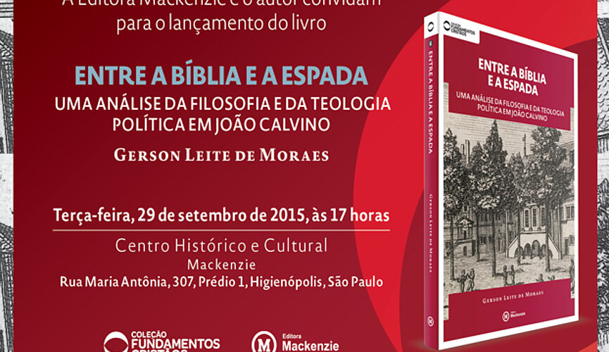 Acontece, no dia 29 de setembro, às 17h, no Centro Histórico e Cultural Mackenzie (CHCM), o lançamento da obra Entre a Bíblia e a espada: uma análise da filosofia e da teologia política em João Calvino. A obra, publicada pela Editora Mackenzie, é de autoria do Prof. Dr. Gerson Leite de Moraes.