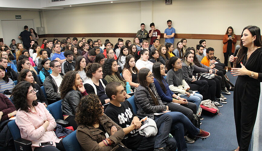 “É uma alegria falar sobre a carreira de delegado durante a Semana do Advogado aqui do Mackenzie. Também sou mackenzista e uma felicidade e nostalgia imensas me acometeram ao entrar aqui novamente”, comenta Raquel, que é formada em Direito pela FDir da UPM.