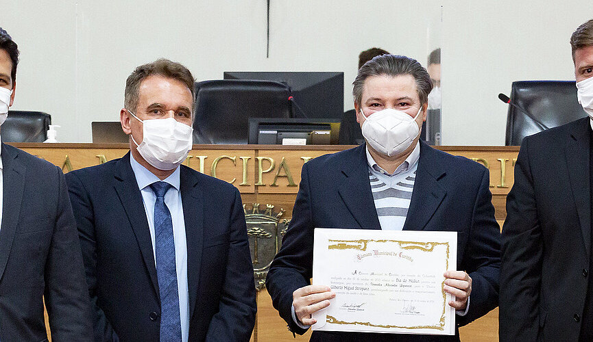 O vice-diretor clínico do Hospital Universitário Evangélico Mackenzie (HUEM), Dr. Gilberto Miguel Stroparo, foi homenageado na Câmara Municipal de Curitiba, nesta segunda-feira, 18 de outubro, em Sessão Solene alusiva ao Dia do Médico, por proposição do vereador e 1º vice-presidente da casa, Alexandre Leprevost.