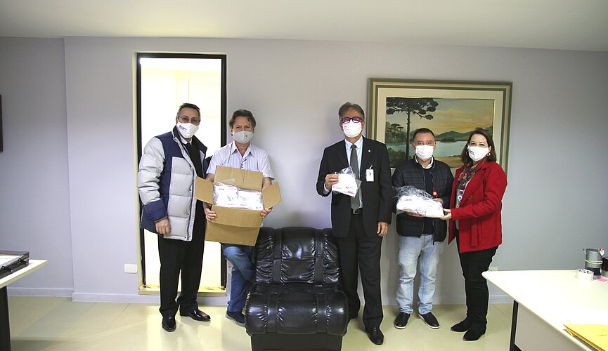 Também foi executada a doação de 2 mil toucas personalizadas para uso dos recém-nascidos e máscaras personalizadas para a proteção dos profissionais em relação ao contágio da Covid-19.